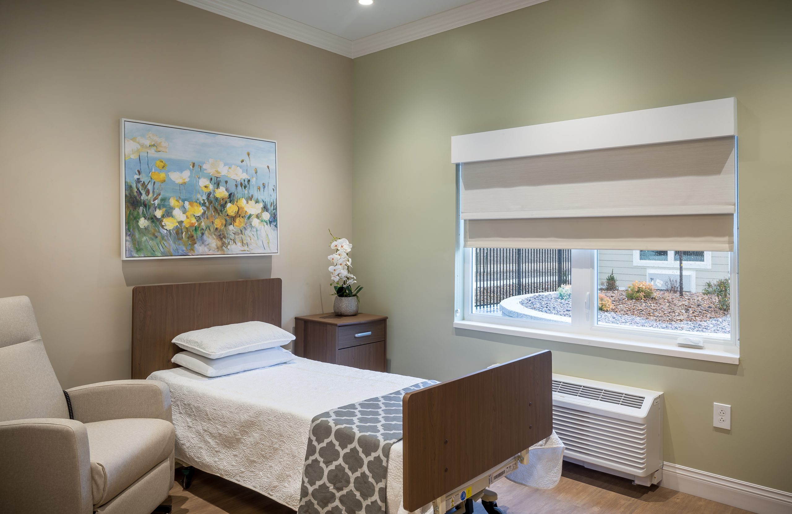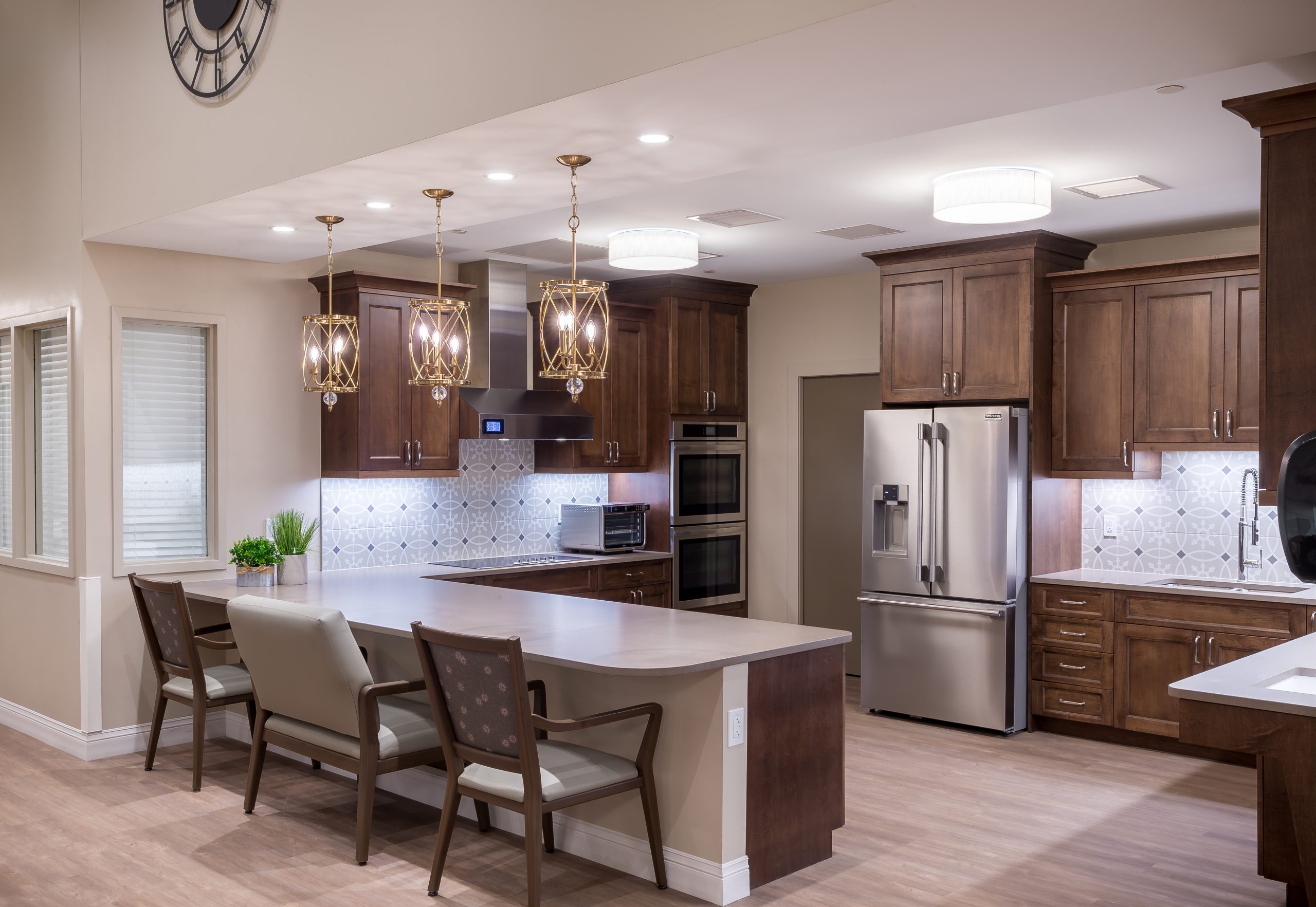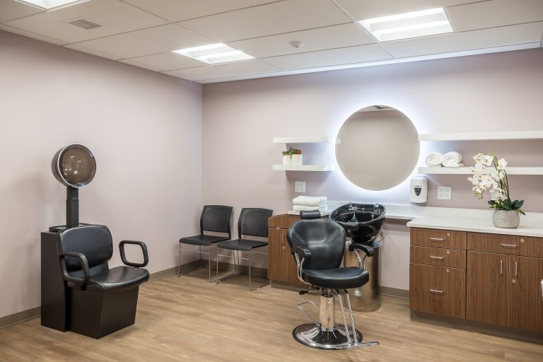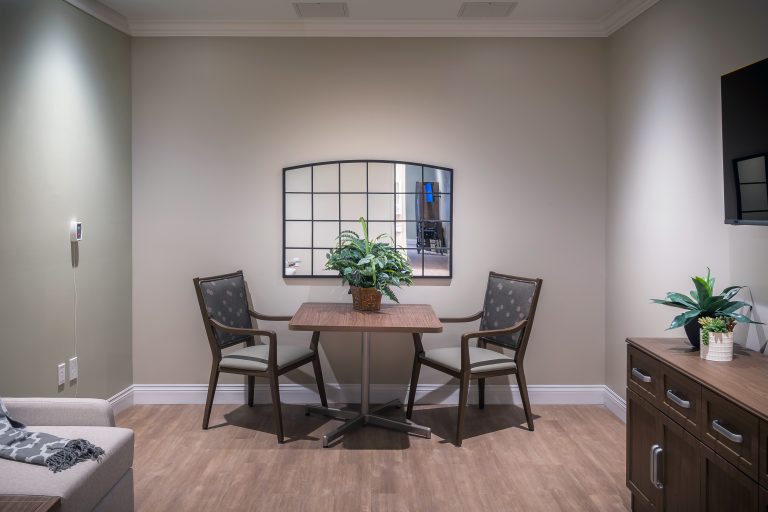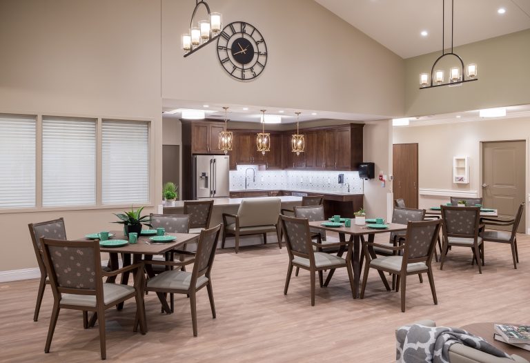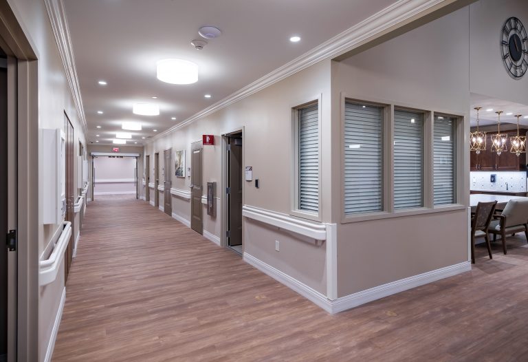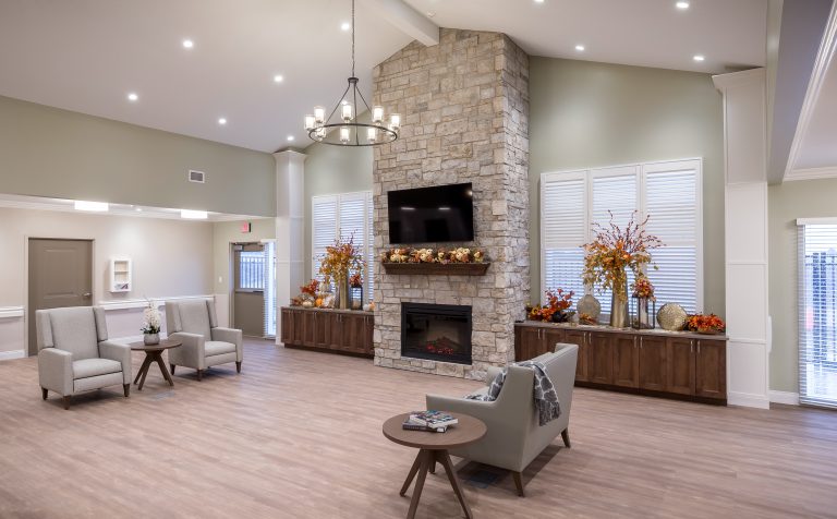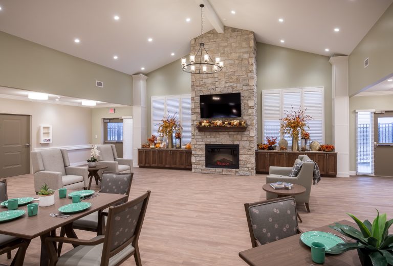 The manor care facility, based on a small house model that emulates the homes from which seniors will move, is designed with traditional wood frames and stone. The 64,000 sq. ft. space features three pods with 36 beds total. Each pod is self-sufficient to function independently with its own kitchen and dining, which was a result of their past experience with COVID-19 protocols. The pods are each designed with unique color palettes to help residents identify their respective spaces, with memory boxes outside each bedroom that residents can customize with family photos, mementos, and other personal items. pa