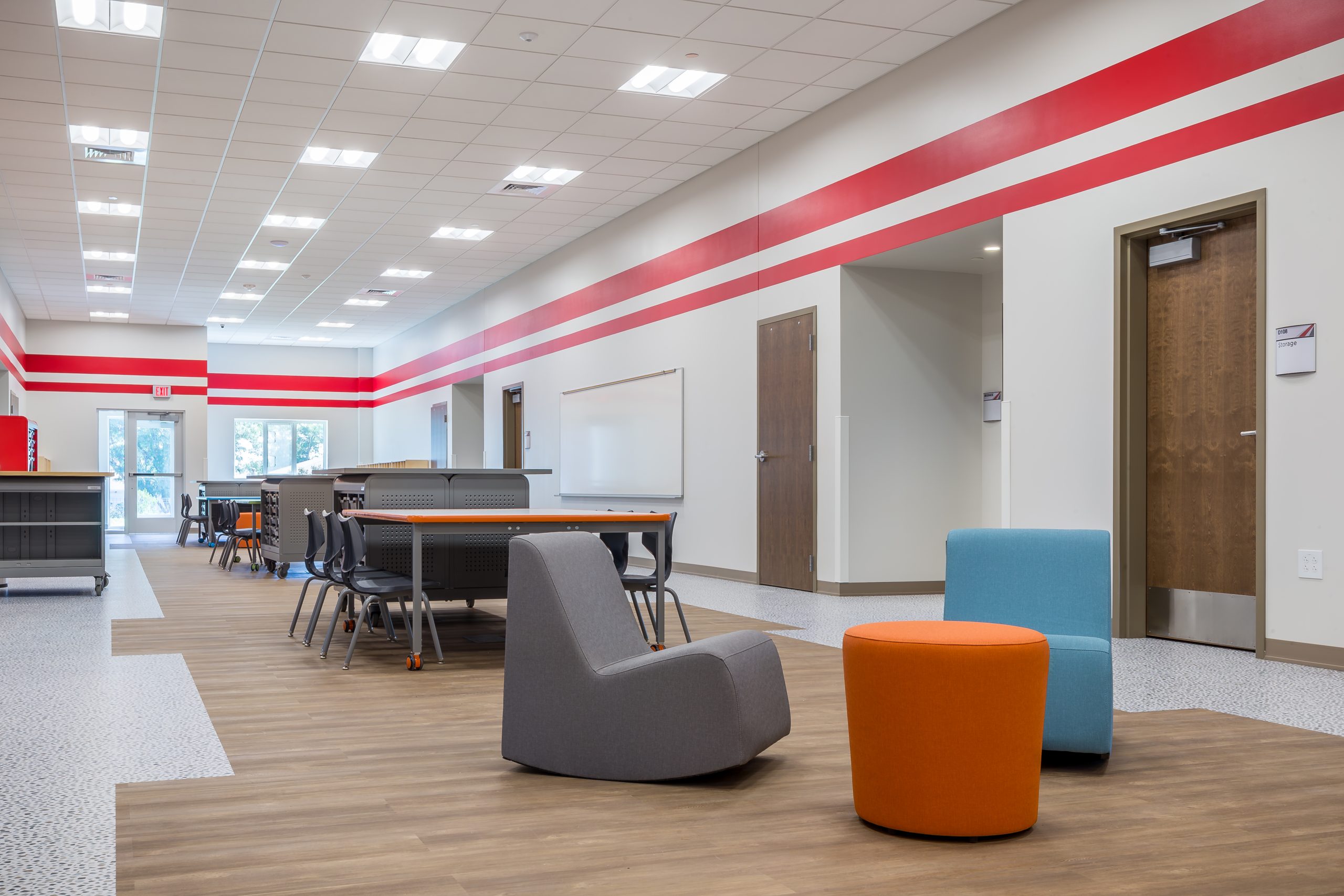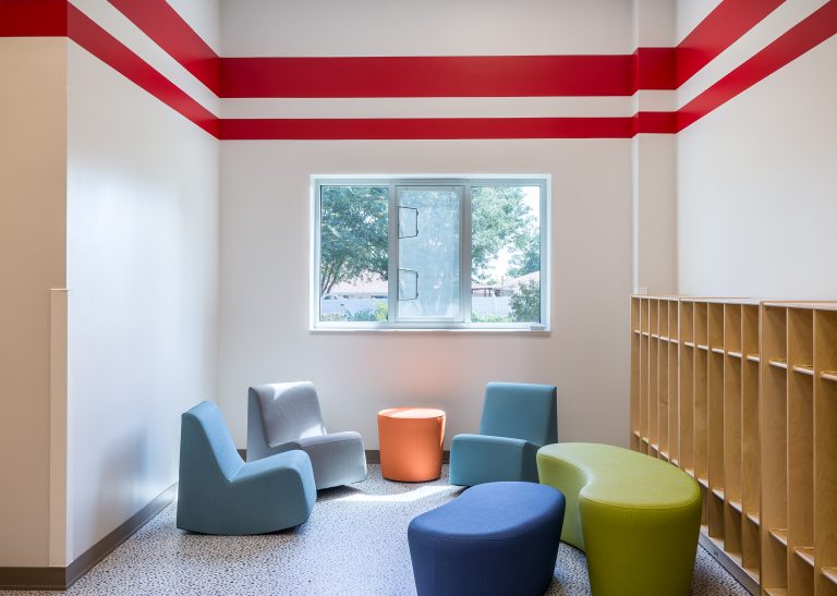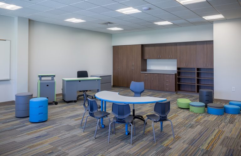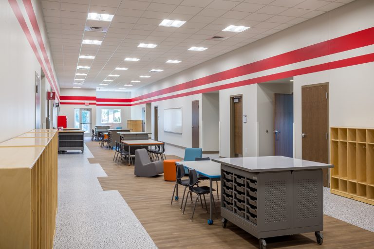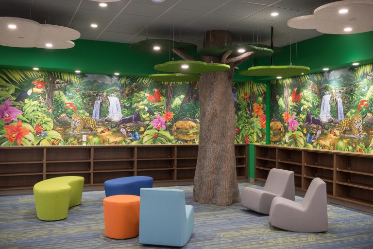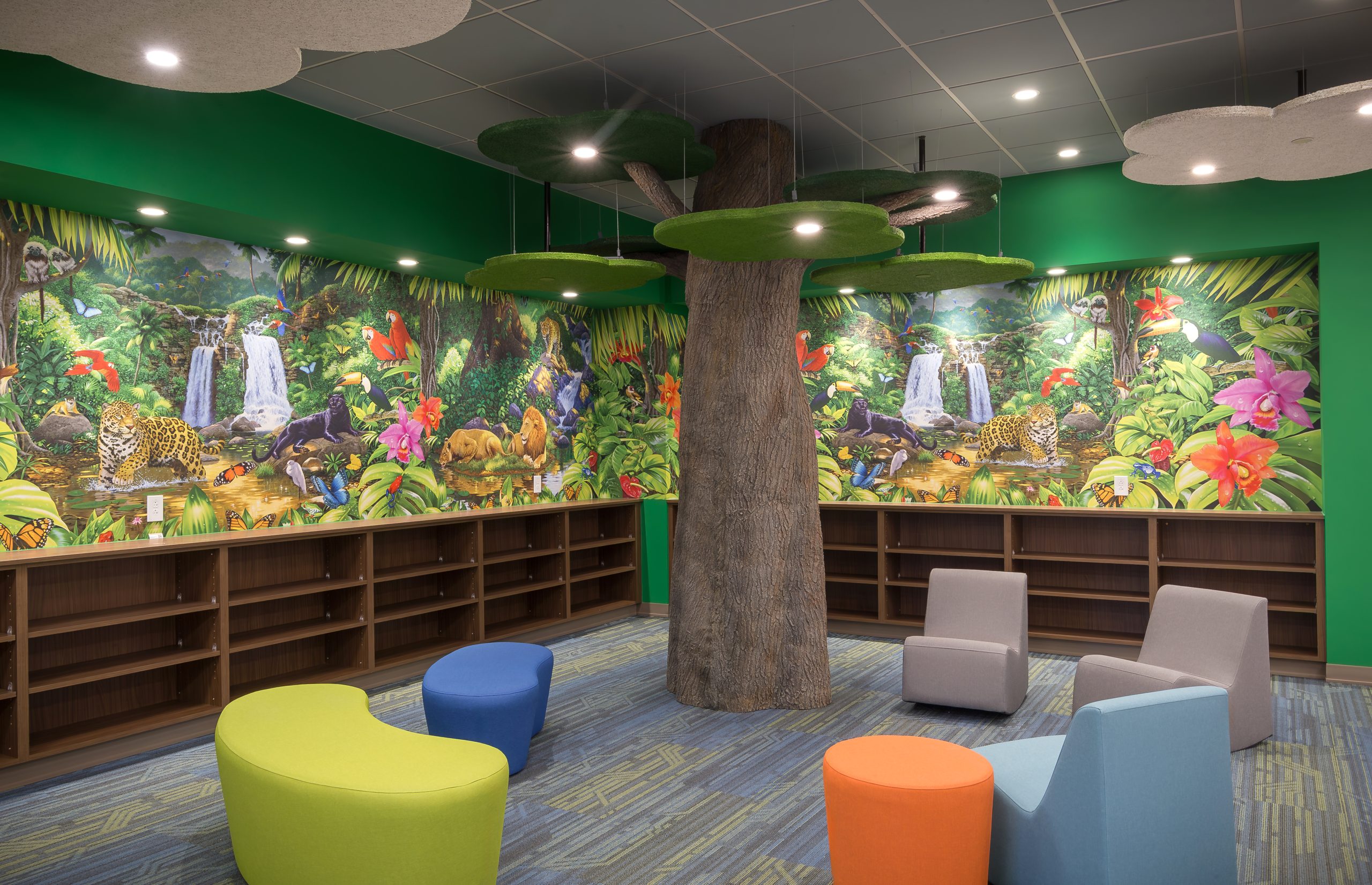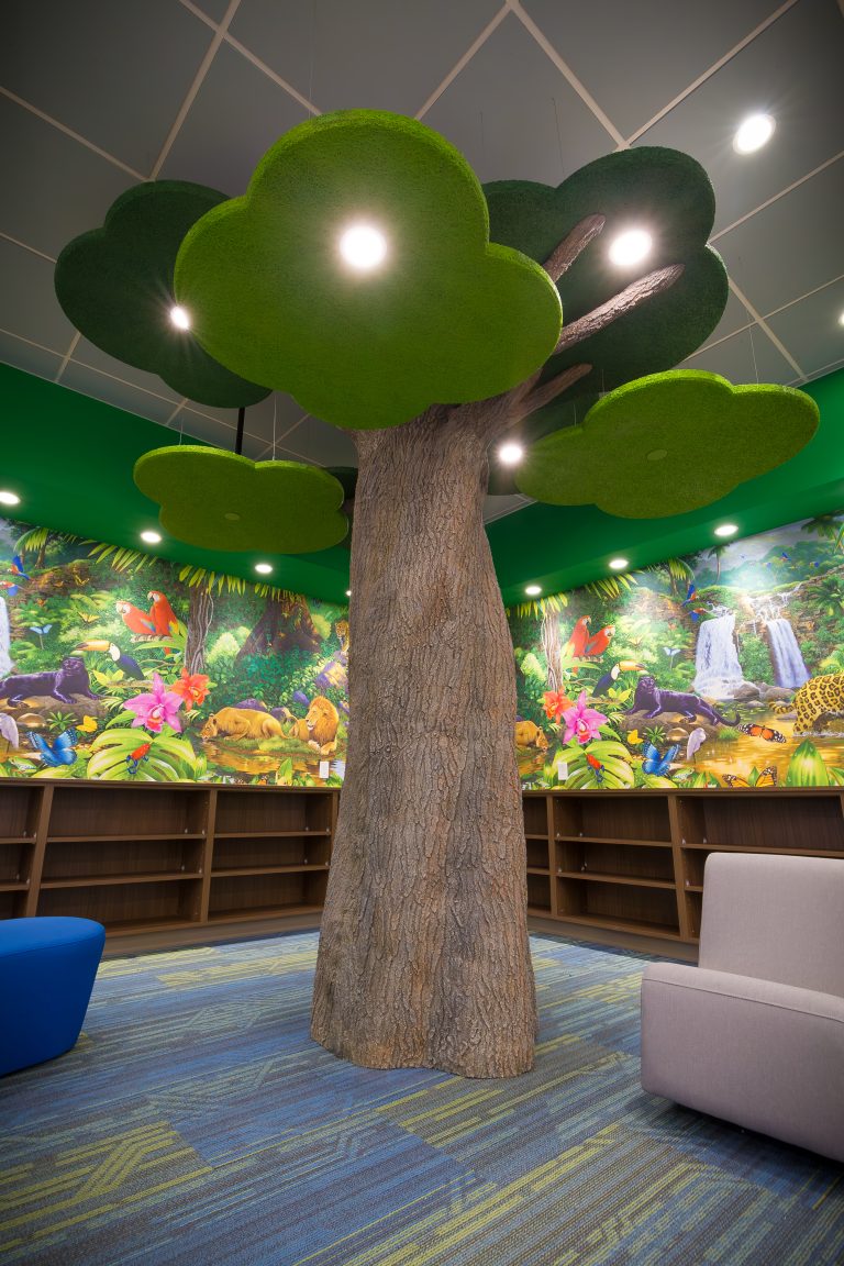 The elementary school includes classrooms for grades Pre-K through 4th and a shared reading space around a large faux tree. Steel tubes form the structure of the tree, wrapped with a faux bark product called ‘flexbark’ from Replications Unlimited. As a highly realistic visual, they use latex molds of real trees to create this product. Custom acoustic ceiling clouds made with Armstrong Tectum create the illusion of leaves above and clouds surrounding the tree. Lighting was carefully integrated so that the function of the space was not lost. Branches protrude through acoustic ‘leaf’ clouds around the tree with green pieces in the surrounding carpet to emulate grass.