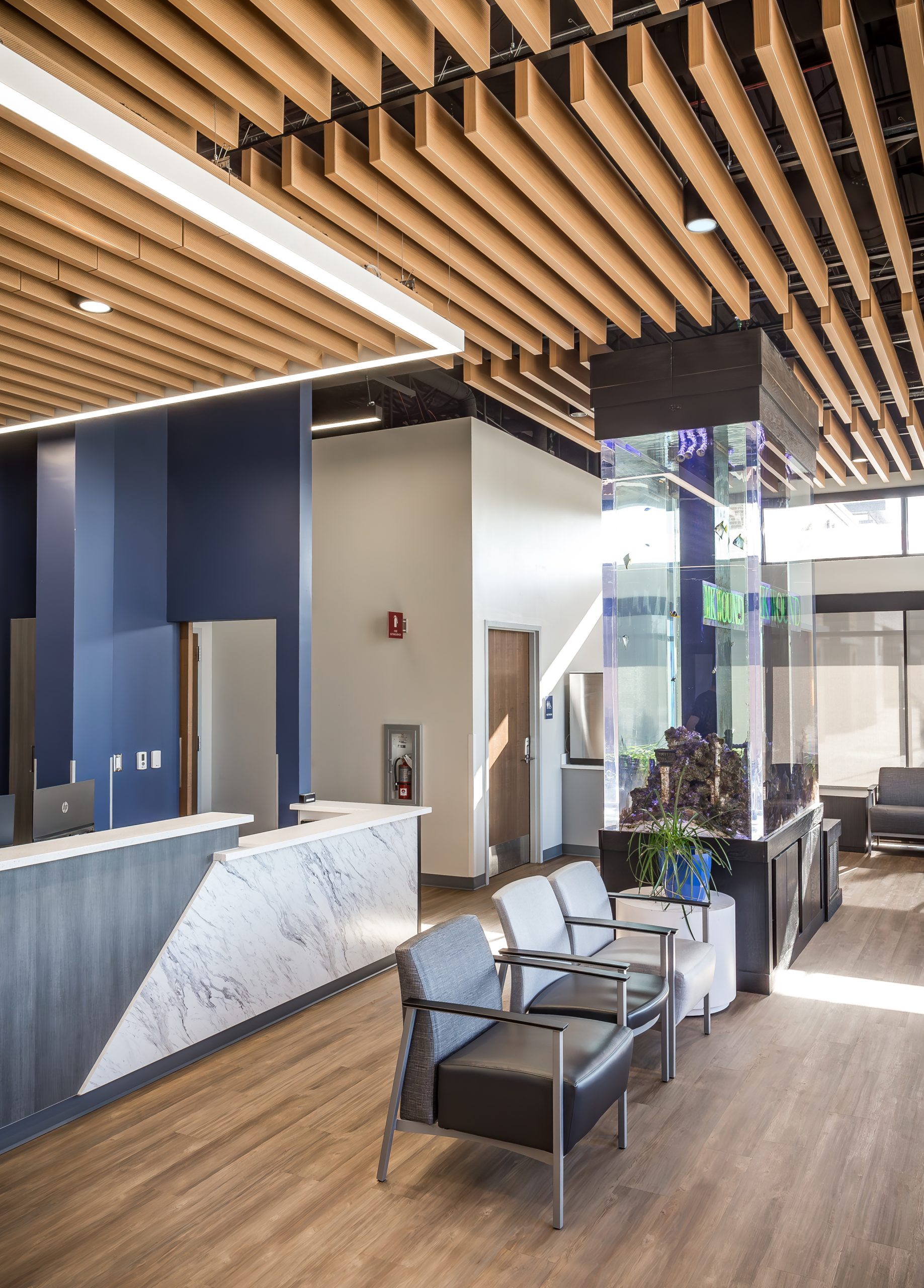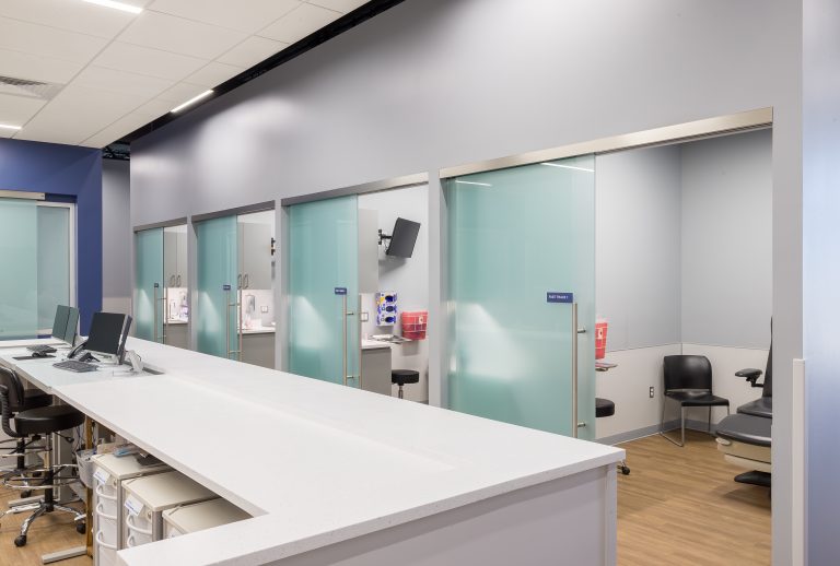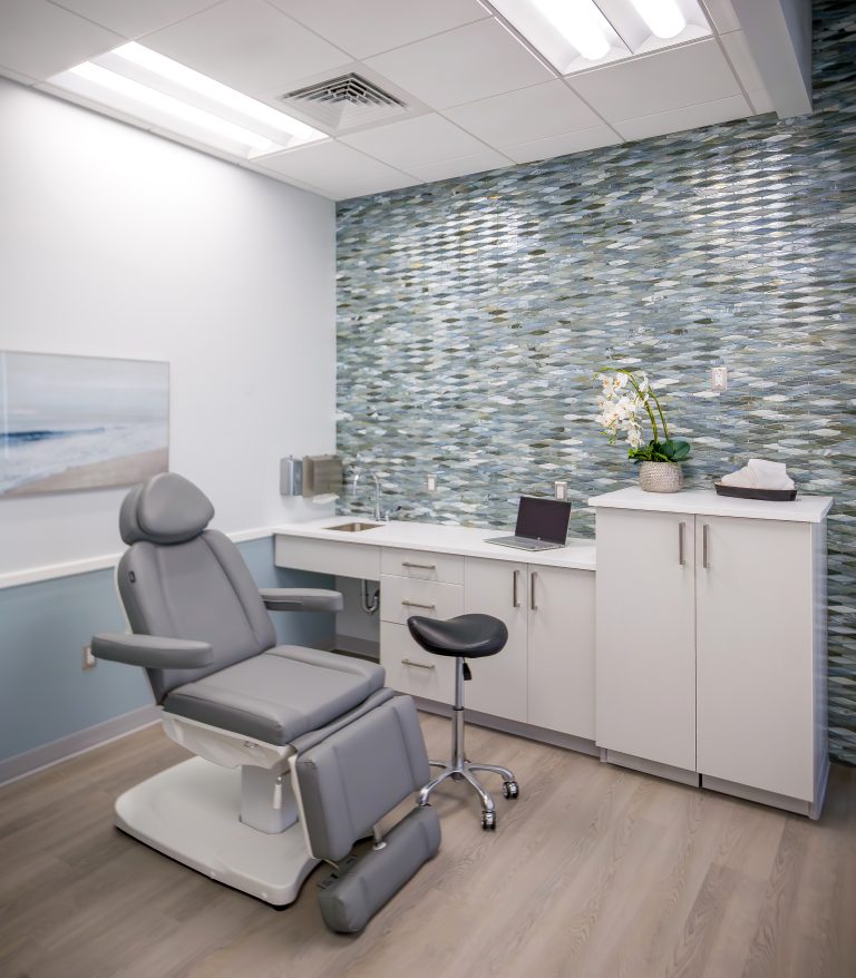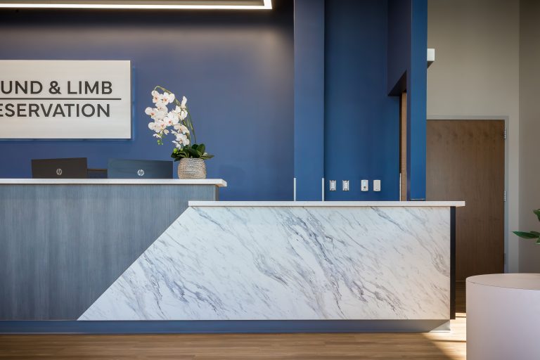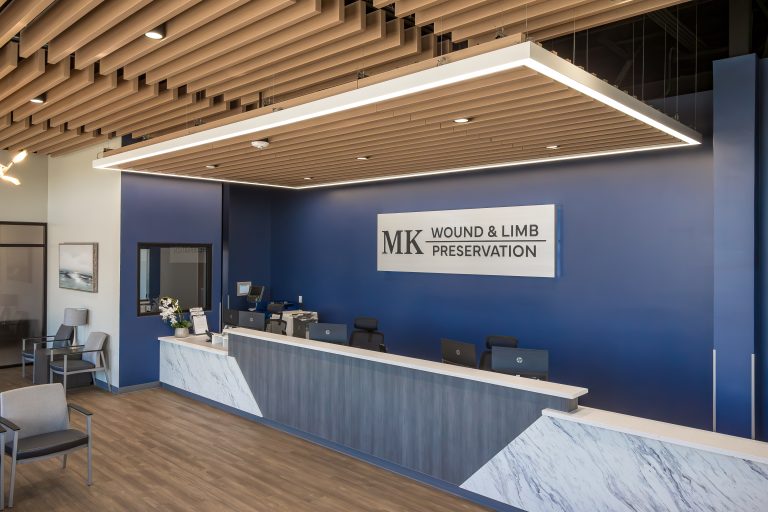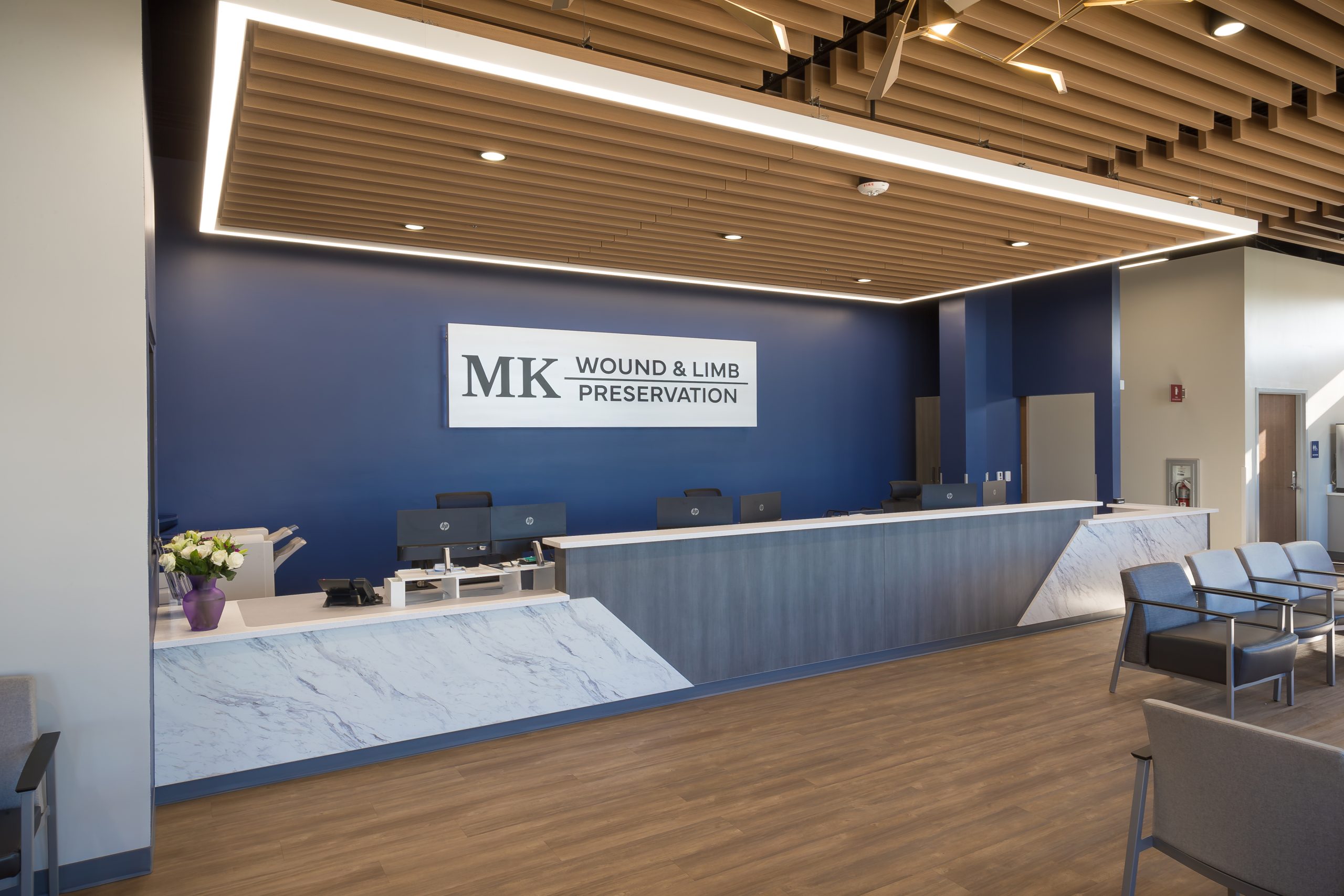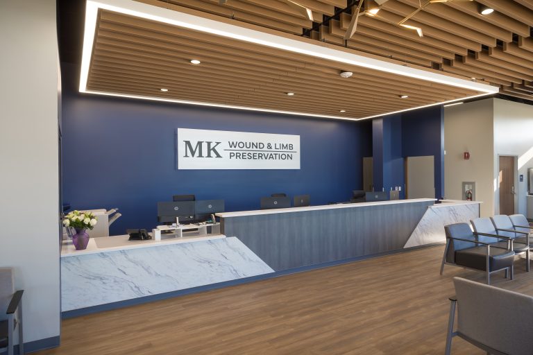 With the goal of bringing dignity to wound care, MK Wound engaged HFG to create an elegant space for specialized treatment. The new clinic, located in a commercially leased space, features cool colors, all accessible entrances with automatic double doors, floating ceilings, and a private ambulatory entrance. The team also designed a large flex space to provide options for future practice expansions. Beyond the architectural features of the space, our interiors team accommodated a large fish tank relocation and liberty bell for patients to ring at the end of their treatment.
