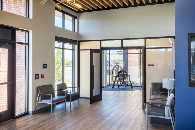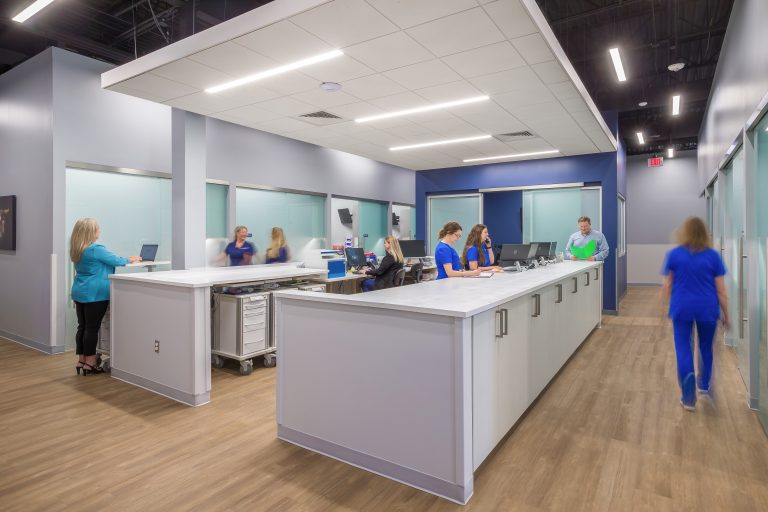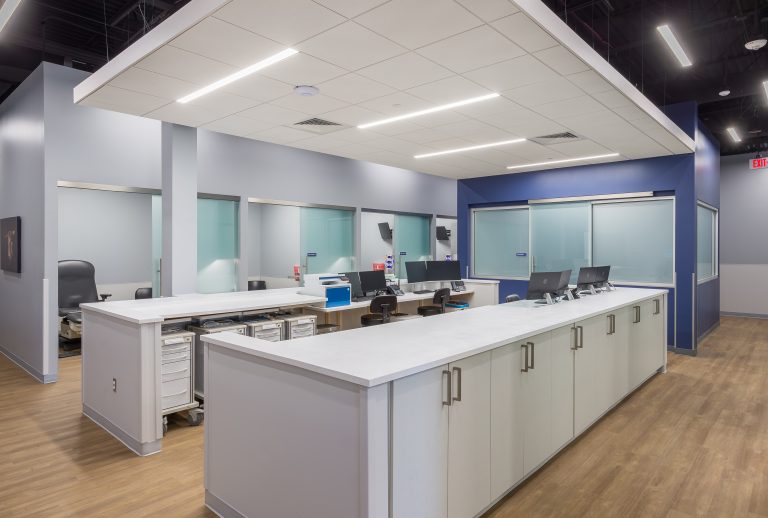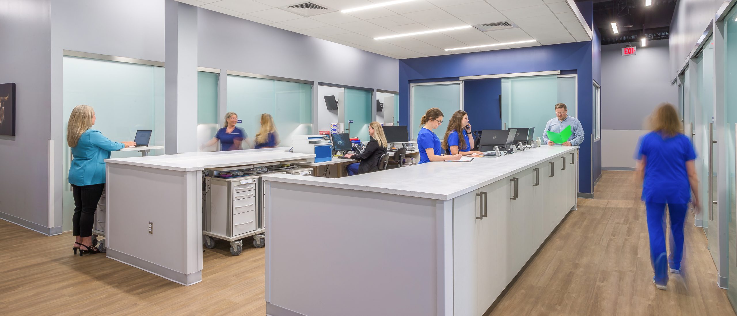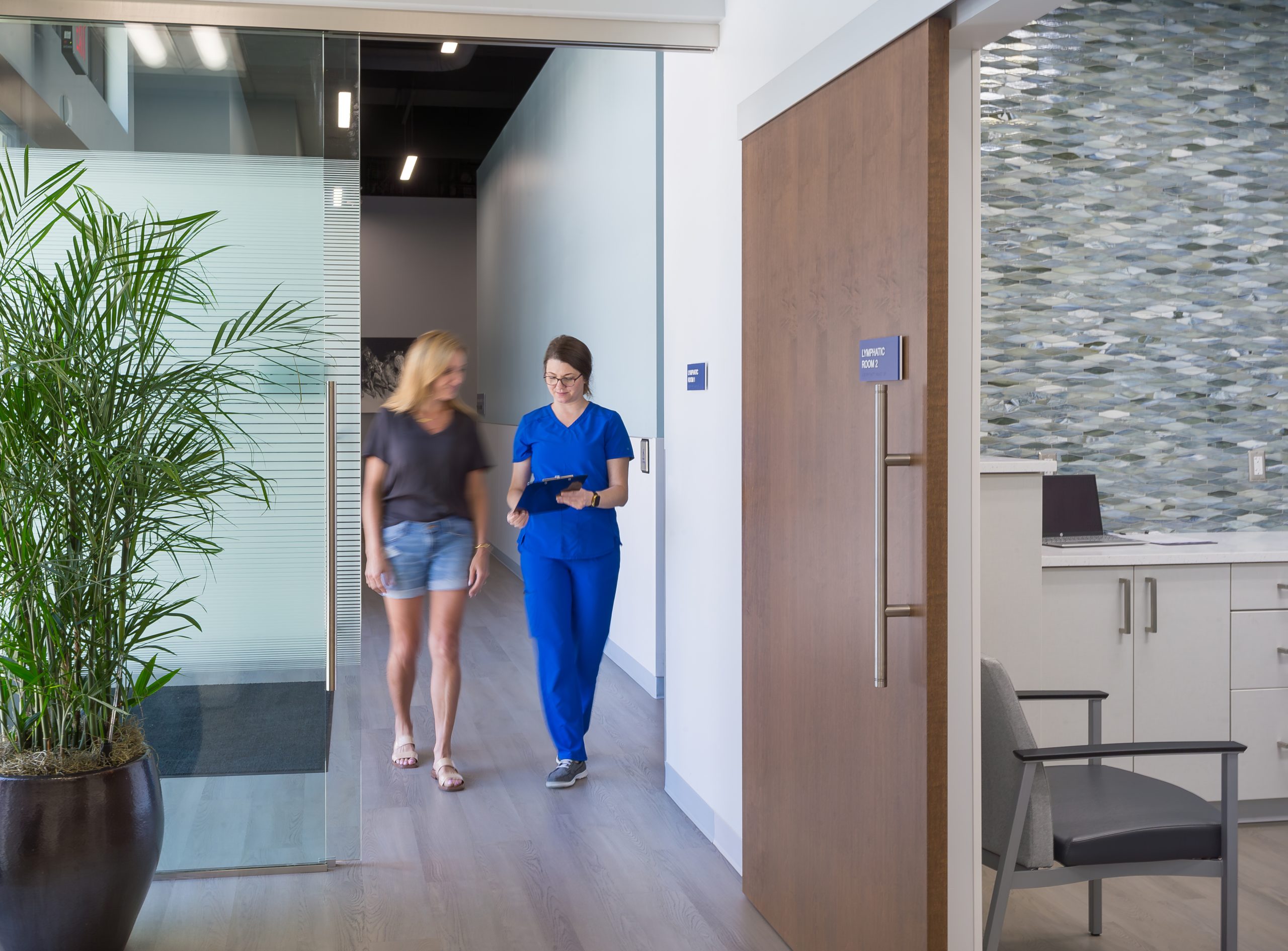 With the goal of bringing dignity to wound care, MK Wound engaged HFG to create an elegant space for specialized treatment. The new clinic, located in a commercially leased space, features cool colors, all accessible entrances with automatic double doors, floating ceilings, and a private ambulatory entrance. The team also designed a large flex space to provide options for future practice expansions. Beyond the architectural features of the space, our interiors team accommodated a large fish tank relocation and liberty bell for patients to ring at the end of their treatment.