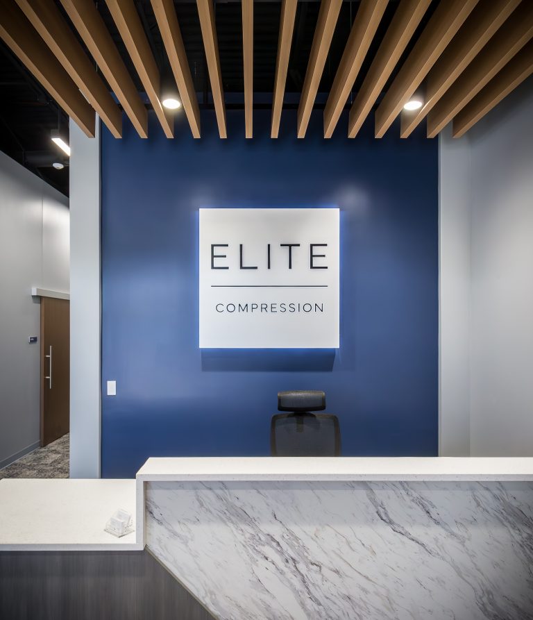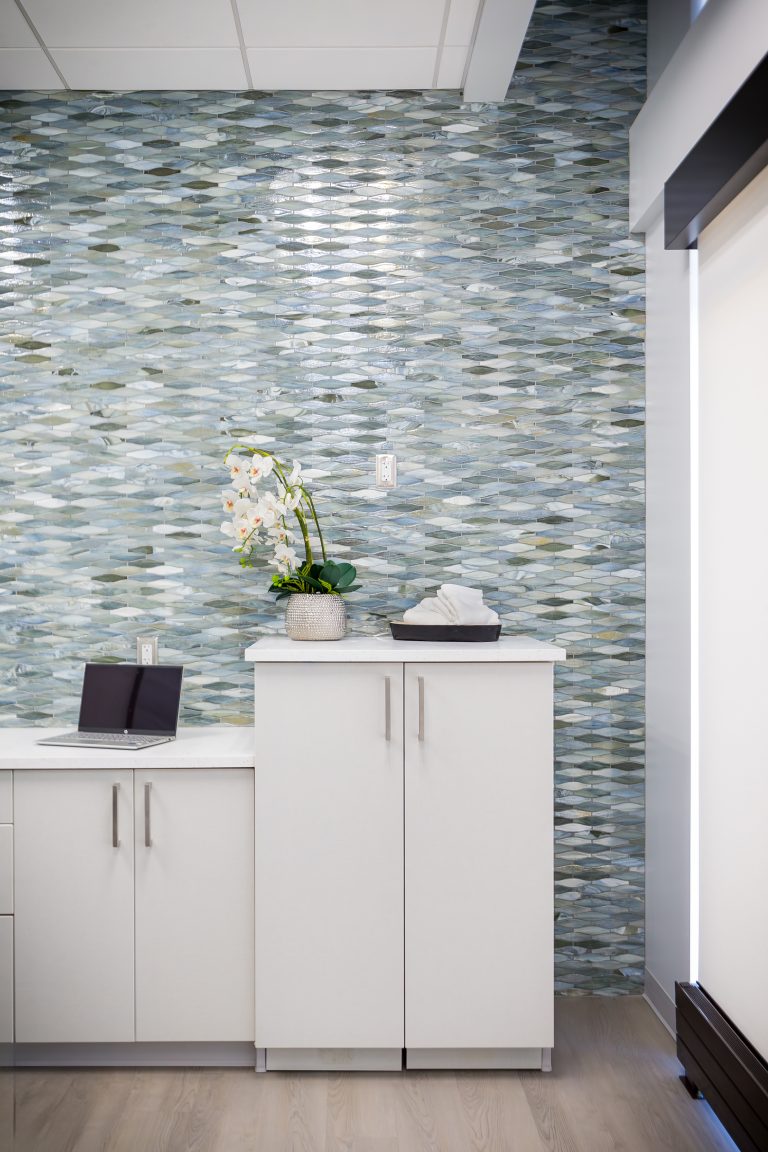This project also included an adjoining space with similar aesthetics for Elite Compression, a lymphatic massage service that MK Wound patients can take advantage of during their treatment for an elevated experience. Although it has a separate entrance, visitors can access the space from the wound care clinic. Elite Compression’s owners wanted their building to feel like a spa, which HFG executed with mermaid tiles and other elegant, beach-inspired features.