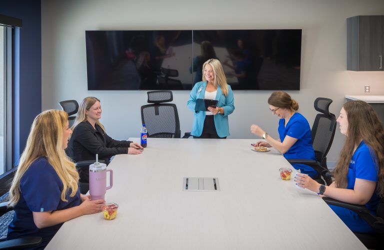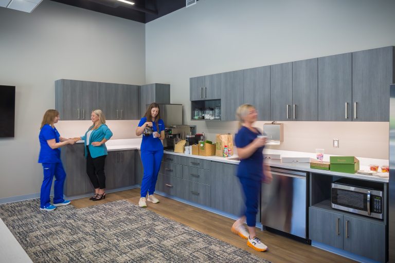 To facilitate streamlined collaboration, the clinic’s nurse station is open and available to the fast-track rooms close by with charting spaces, administrative offices, and medical supply room. This supply room is uniquely organized by patient name with supplies each patient will need during their course of treatment. Additional features that facilitate a good staff experience include an outdoor patio adjoining the conference/break room, and our team considered all staff feedback as we provided configuration options based on patient flow in a space with established utilities. As some of the longest tenured staff in the industry, each employee’s input was extremely useful in designing a space meant to elevate the wound care experience.