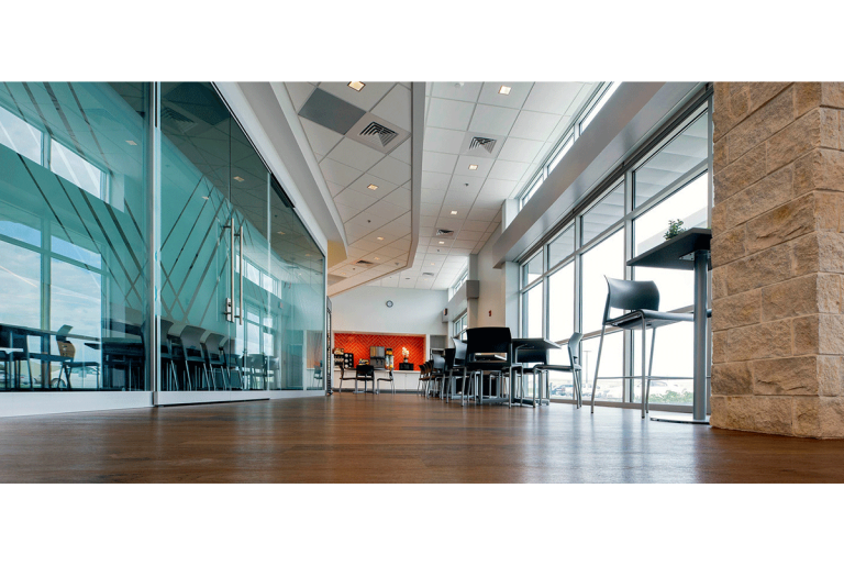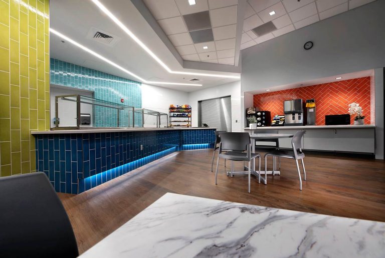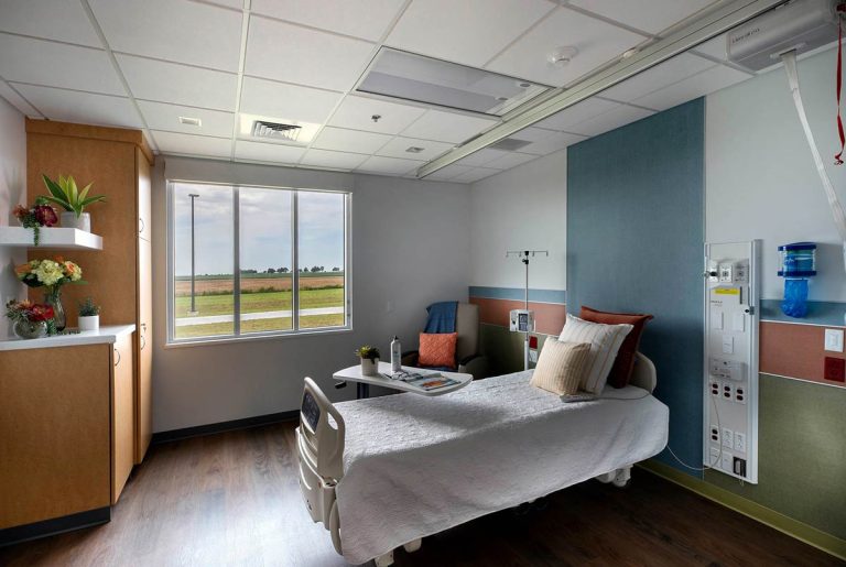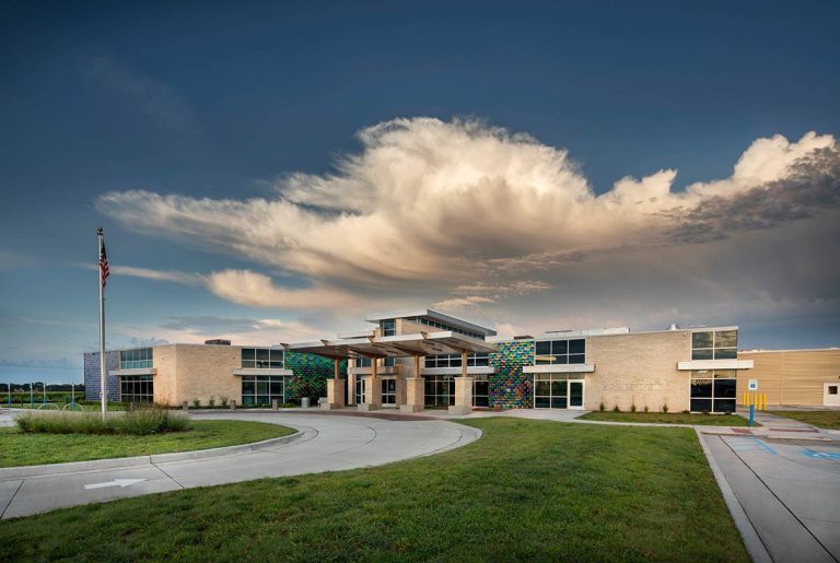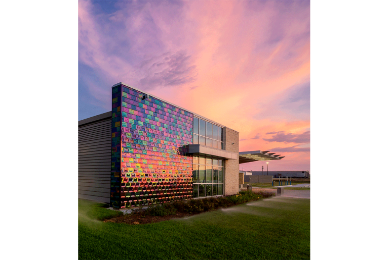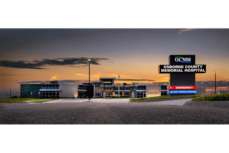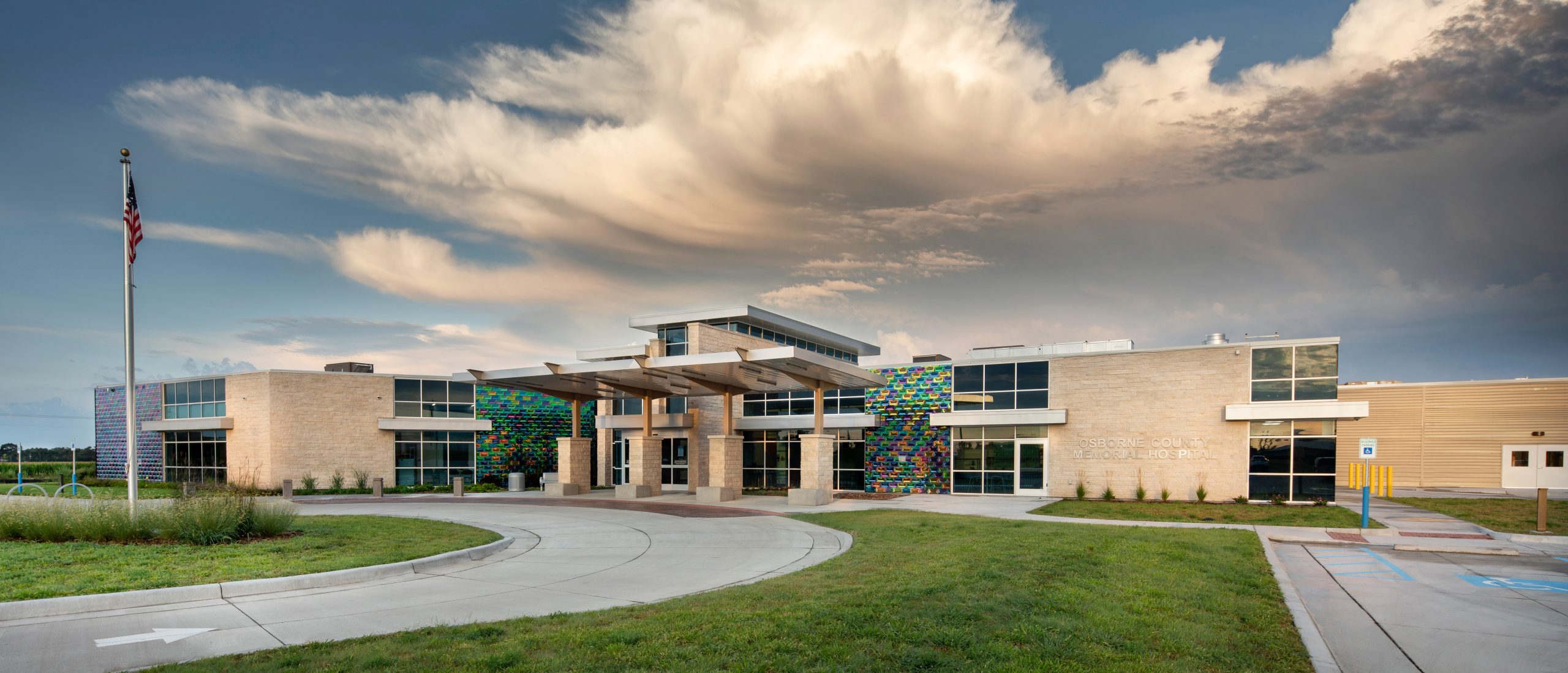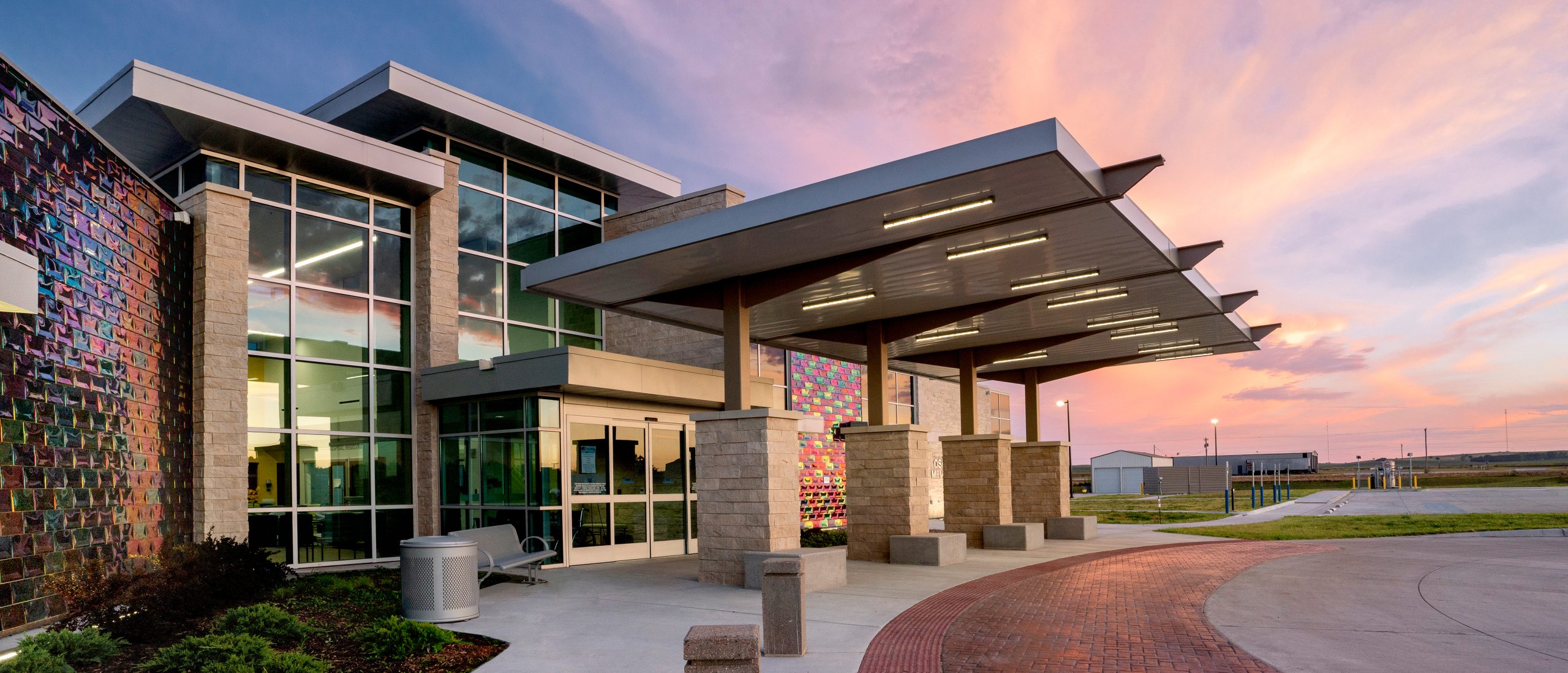 For this project, HFG delivered an aesthetically bold replacement hospital by working with the client to select unique exterior finishes that capture the beauty of sunsets on the prairie. Approaching Osborne County Memorial Hospital, visitors will start to notice that portions of the building shell reflect sunlight into a dazzling rainbow of metallic hued colors. Upon closer inspection, it becomes apparent that the effect is produced by walls of colorful tiles known as “Peacock Tiles” from manufacturer Millennium Forms. These stainless steel panels are dipped in acid to create weather resistant iridescent colors that are integral to the chemical structure of the panels themselves. As a result, the tiles reflect different color palettes depending on the lighting conditions of each new day. Just as every sunset is unique, HFG strives to create a one-of-a-kind healthcare destination for each client we serve.