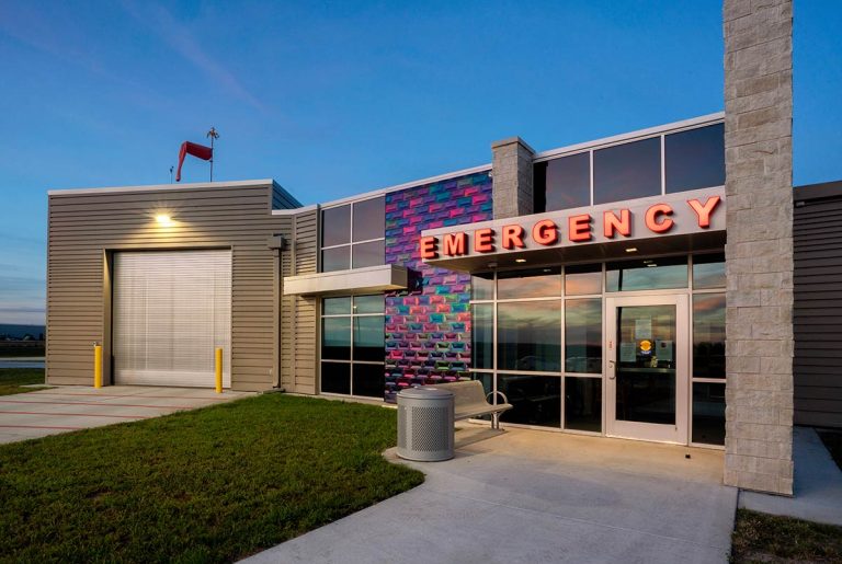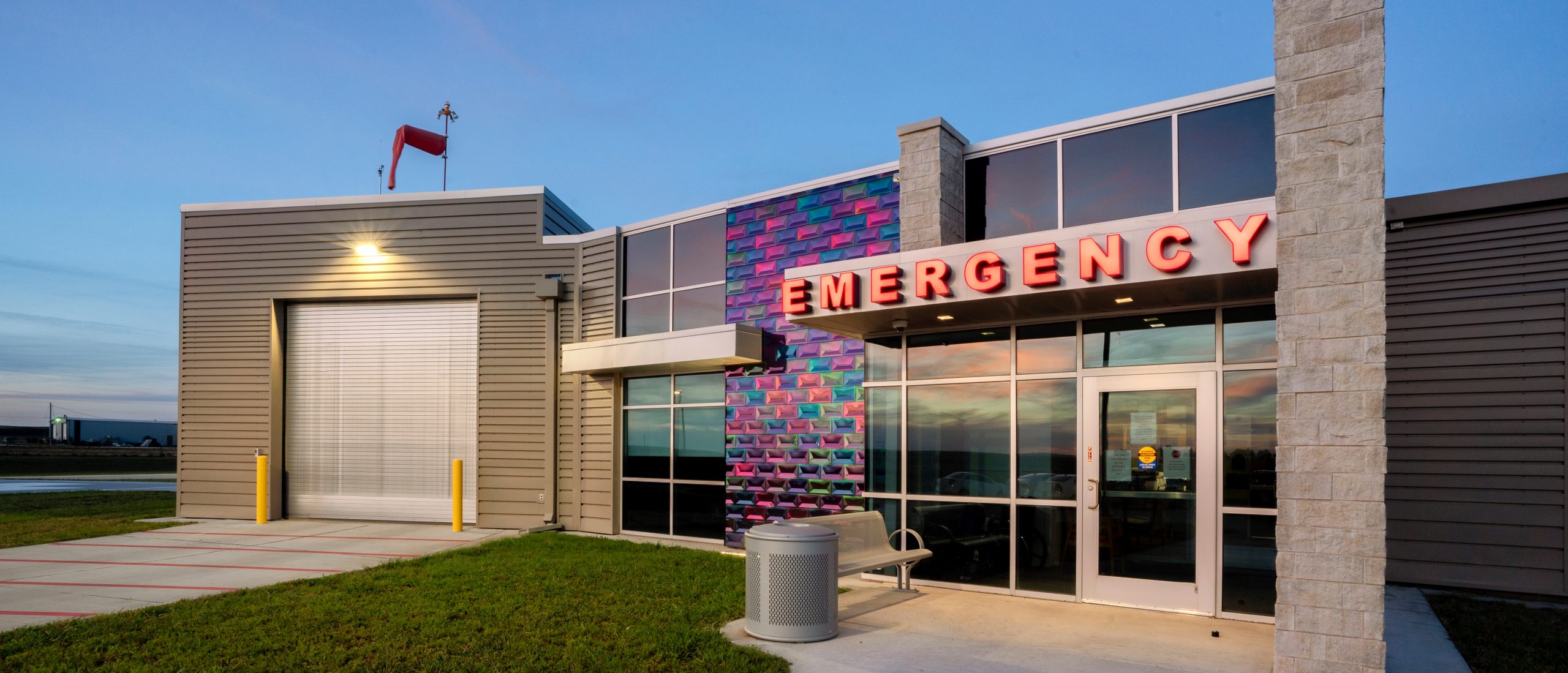 This replacement hospital features a clinic with 8 exam rooms; a specialty clinic with 4 exam rooms; PT/OT, including hydrotherapy and a gym that serves as a community wellness space after hours; imaging, including ultrasound and mammography; lab services; an operating room; a scope procedure room; 8 single patient rooms (1 of which has isolation capacity); 4 double patient rooms; and an emergency department with exam/triage, a trauma bay, and an adjacent emergency helipad. HFG’s flexible floorplan incorporates a unique arrangement in which the emergency department and inpatient wing are located next to each other. Because the inpatient wing is not always fully occupied, this proximity allows it to serve as an extension of the emergency department should a single incident ever result in a high casualty count.