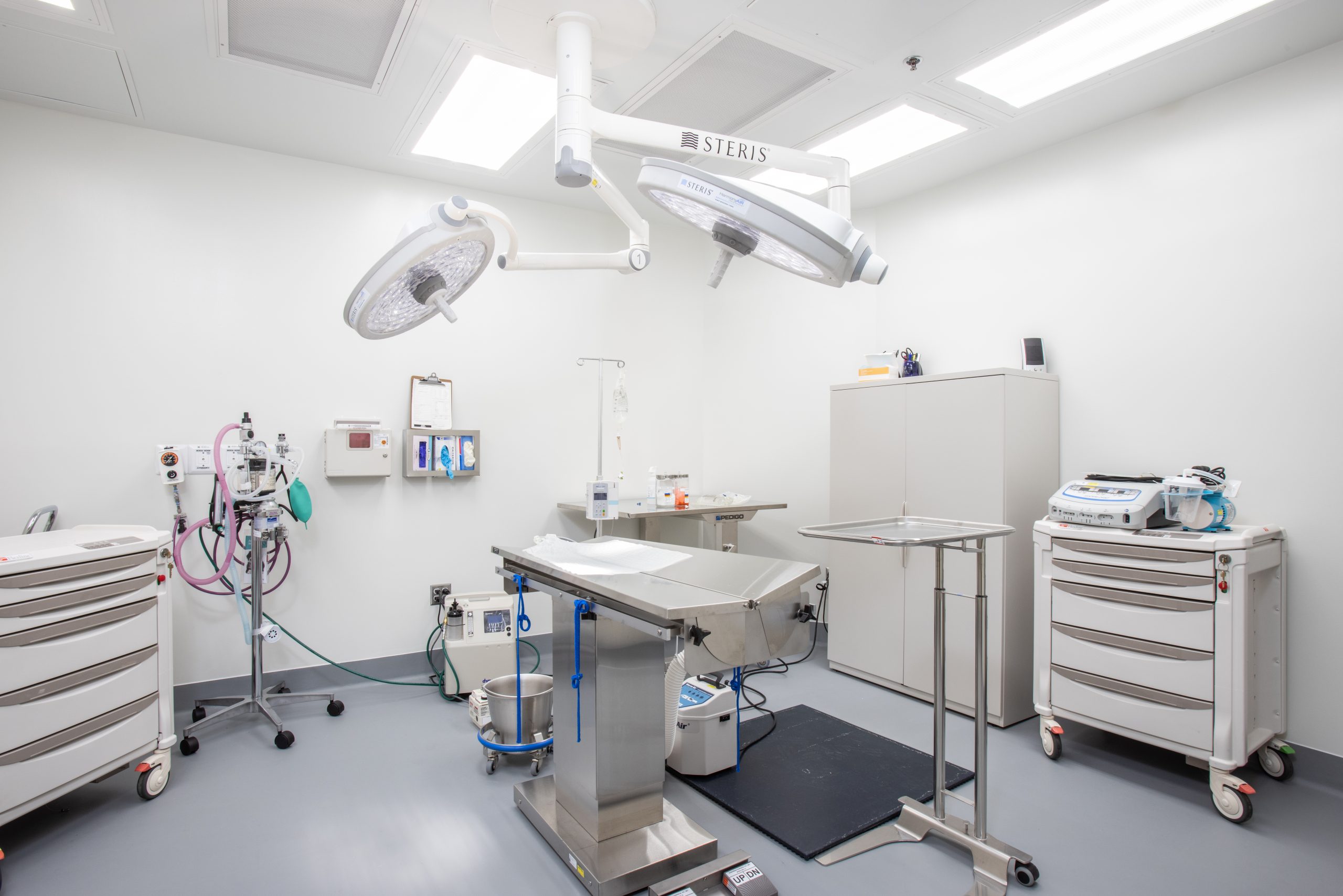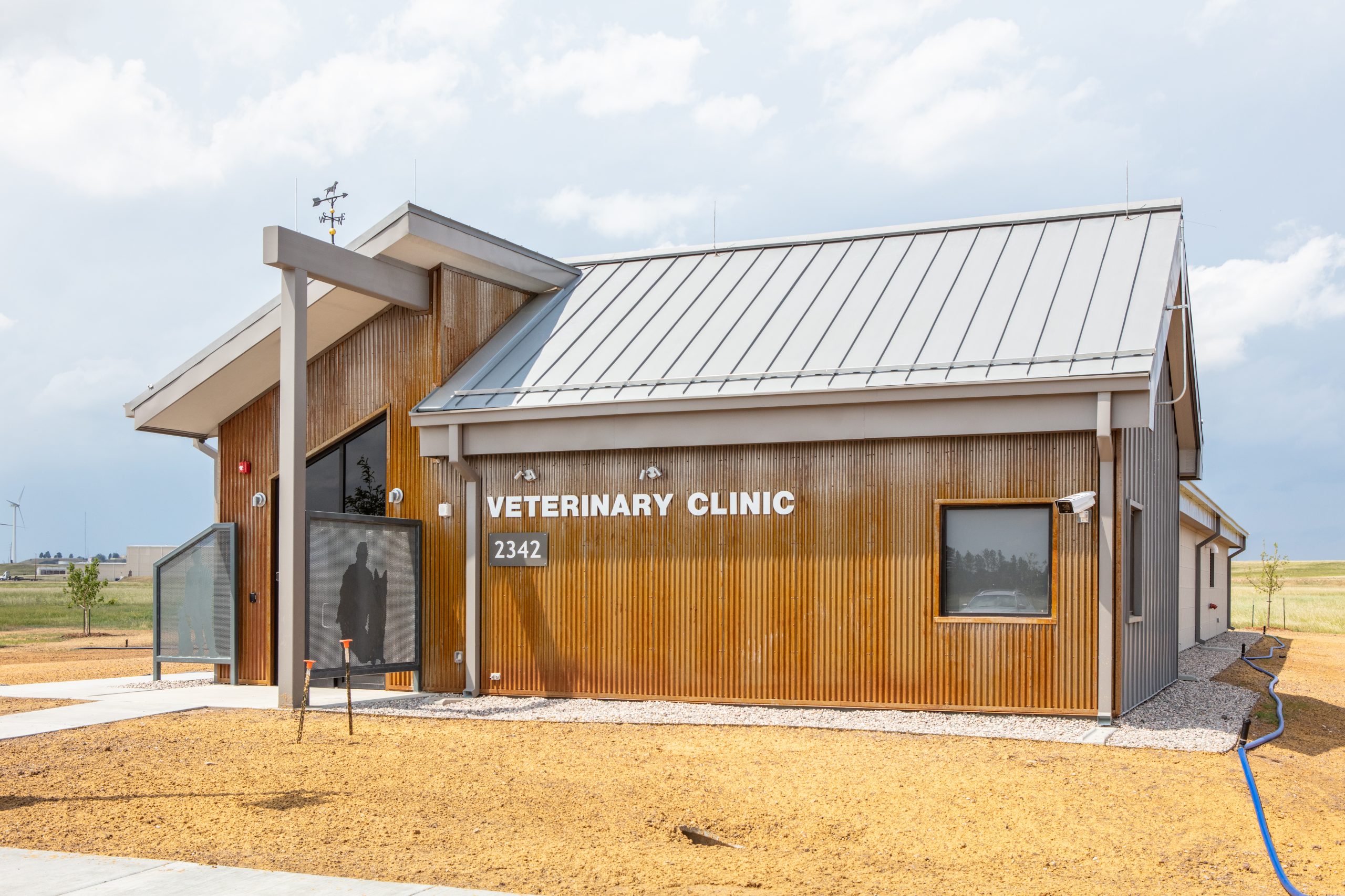 HFG also designed a 1,100 SF Ambulance Garage Addition and a new, 4,500 SF Veterinary Clinic for military dogs and companion animals. The Veterinary Clinic was fully sprinklered and constructed with concrete masonry units (CMUs). It features two treatment rooms, one surgery room, one prep/post-operative room, a lobby, and administrative offices. Specifications were created in compliance with NFPA 150, which is specific to animal shelters and veterinary clinics. The clinic’s layout was designed to separate companion animals from military working dogs and includes separate entrances for each group. The public entrance is flanked with windscreens consisting of painted powder coat finished metal panels that are laser cut with the silhouettes of working dogs.