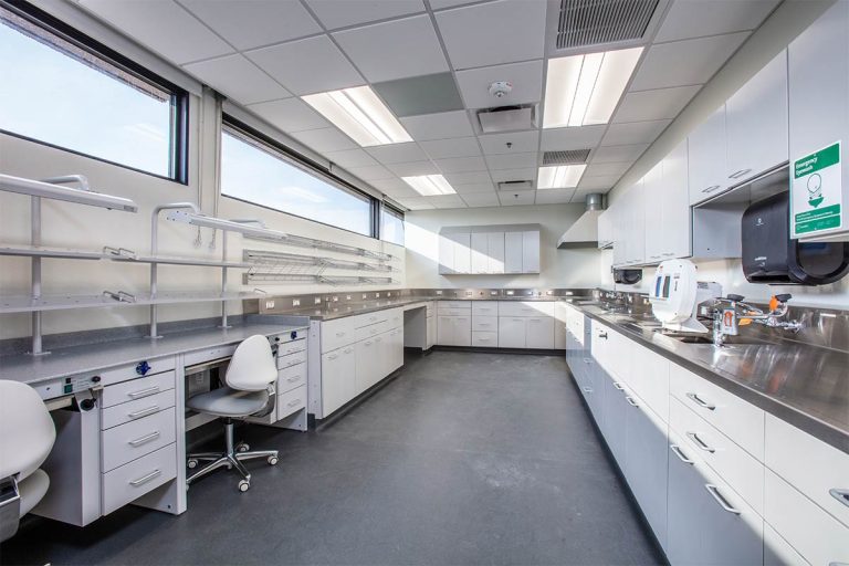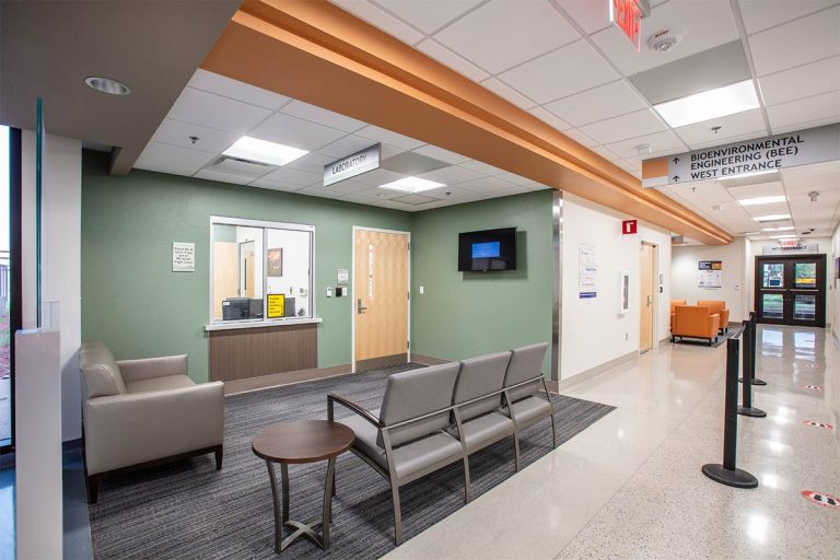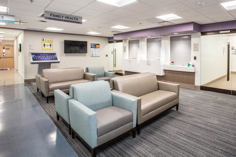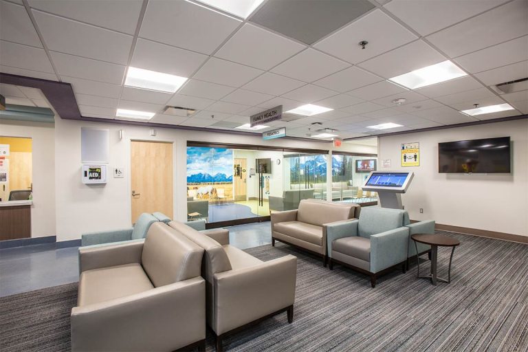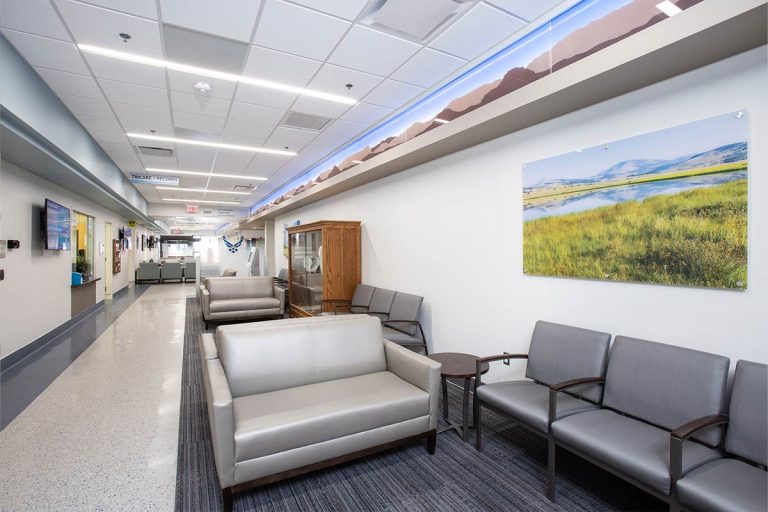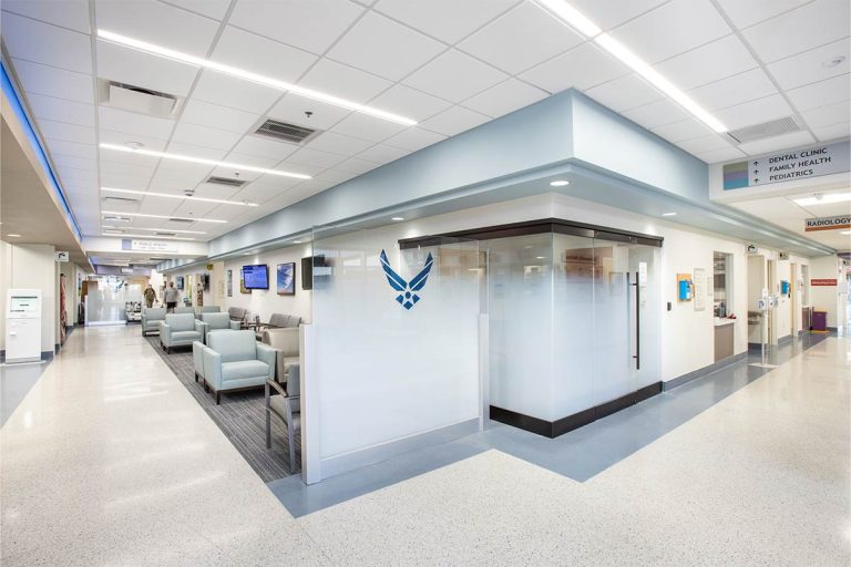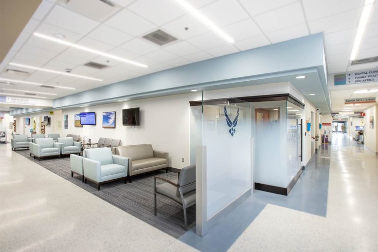 Within the “Main Street” retail concept, departments with the highest volumes are relocated closest to public entrances and all relocated clinic services can still be located by direct visual access and coordinated colors for optimized wayfinding. Remodeled departments include dental, pharmacy, family/women’s health, allergy/immunization, laboratory, radiology, pediatrics, optometry, logistics/facilities, records, command/management, flight medical / base medical, environmental monitoring, mechanical/electrical rooms, education/training, and systems. In order to ensure that operations remained uninterrupted throughout construction of the medical clinic, HFG designed 2 highly complicated Temporary Phasing Facilities (TPFs). Each TPF was approximately 10,000 SF and accommodated different departments during a total of four phases.